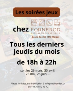 Après une journée de travail, détendez-vous avec une soirée jeux spéciale afterwork chez Fornerod : un moment convivial pour se retrouver, s’amuser et découvrir de nouveaux jeux ! Nos animateurs seront présents pour vous guider et expliquer les règles, afin que vous puissiez profiter pleinement de chaque partie. De 18h à 22h, tous les derniers jeudis du mois.